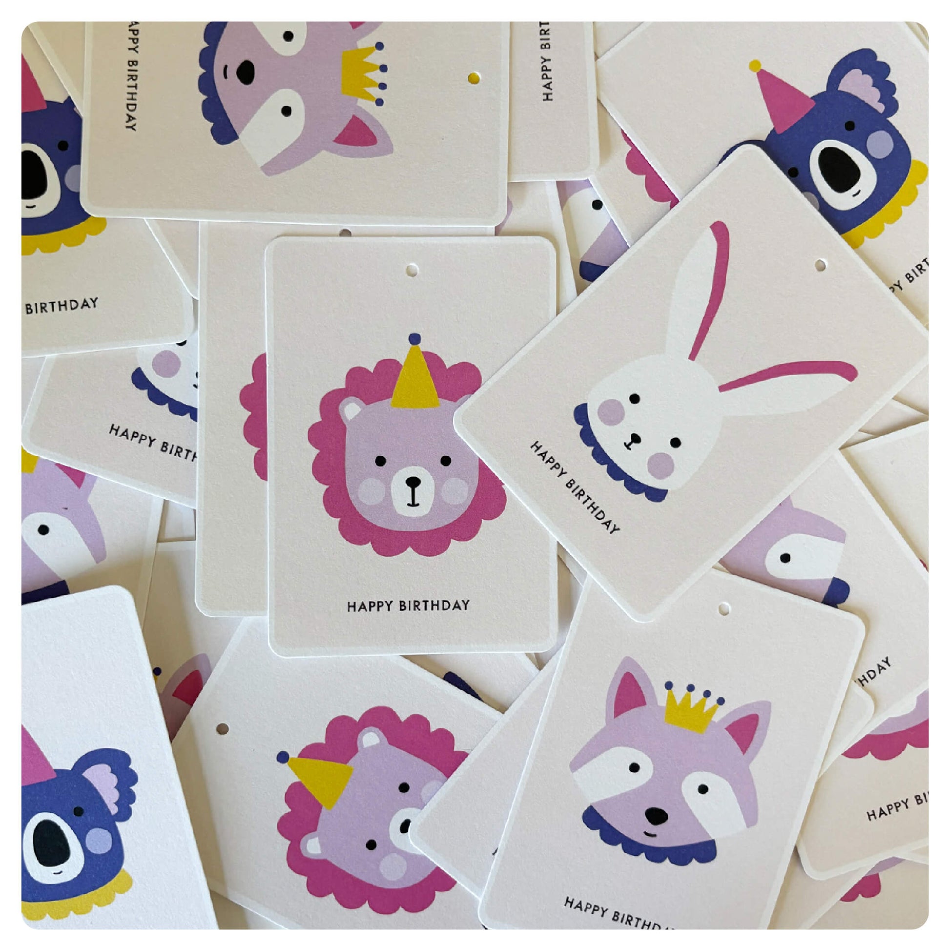 Each pack includes 5 uniquely illustrated birthday animals, complete with thread for tying. Printed on a textured 300gsm stock, each tag measures 70mm x 100mm, with a blank back - perfect for adding your own special note.